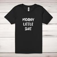 Moany Little Shit Adult T-Shirt\nA rude unisex adult t-shirt with "Moany Little Shit" printed across the front of a 100% cotton* t-shirt. This rude t-shirt is great as a gift for any occasion.\nAll of our adult t-shirts are designed and hand-printed in the UK and are manufactured from quality 100% pre-shrunk jersey cotton knit for substantial softness and comfort. When quality, durability and substance count, this is the tee everyone can agree on. Featuring a crew neck, short sleeves, twin needle sleeve and bottom hems and unisex sizing. Available in sizes Extra Small to 5XL*.\n\n*Black & White tees available in sizes XS - 5XL, all other colours available XS - 2XL\n\nSize Guide\nUnisex adult t-shirts are measured around the chest, in inches\n\nXS 32/34"\nS 34/36"\nM 38/40"\nL 42/44"\nXL 46/48"\n2XL 50/52"\n3XL 54/56"\n4XL 58/60"5XL 62/64"\n\nSee more on our clothing size guide (opens in new tab)\n\n\nPlease Note\nAll of our adult t-shirts are hand-printed to order, as a result, colours may vary between prints - images are for illustration purposes only.\n