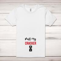 Pull My Cracker Adult T-Shirt\nA novelty adult t-shirt with "Pull My Cracker" printed across the front of a 100% cotton* t-shirt. This novelty t-shirt is great as a gift for any occasion.\nAll of our adult t-shirts are designed and hand-printed in the UK and are manufactured from quality 100% pre-shrunk jersey cotton knit for substantial softness and comfort. When quality, durability and substance count, this is the tee everyone can agree on. Featuring a crew neck, short sleeves, twin needle sleeve and bottom hems and unisex sizing. Available in sizes Extra Small to 5XL*.\n\n*Black & White tees available in sizes XS - 5XL, all other colours available XS - 2XL\n\nSize Guide\nUnisex adult t-shirts are measured around the chest, in inches\n\nXS 32/34"\nS 34/36"\nM 38/40"\nL 42/44"\nXL 46/48"\n2XL 50/52"\n3XL 54/56"\n4XL 58/60"5XL 62/64"\n\nSee more on our clothing size guide (opens in new tab)\n\n\nPlease Note\nAll of our t-shirts are hand-printed to order, as a result, colours may vary between prints - images are for illustration purposes only.\n\n