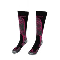 Salomon Ski Snowboard Socks - Black/Pink\n\nProperties:\n\nWarm socks made of Cordura material and Merino wool, which is extremely thin but very warm and elastic.\n\nMerino wool keeps you warm even when wet.\n\nThe structure of Cordura fibers is characterized by above-average resistance to abrasions and abrasions.\n\nThe socks have a shin guard reinforced with terry cloth.\n\nAn ankle brace is an elastic band around the ankle that prevents injuries to the tendons and muscles in this area.\n\nFlexible midfoot support that does not restrict freedom of movement.\n\nFlat seams on the fingers and reinforced toe area.\n\nUniversal socks for winter sports.\n\nMaterial:\n\n37% Nylon, 29% Polypropylene, 16% Acrylic, 16% Merino Wool, 2% Elastane.\n\nColor:\n\nBlack\n\nPink\n\n