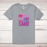 Fat Kid Loves Cake Adult T-Shirt\nA novelty unisex adult t-shirt with "I Love You Like A Fat Kid Loves Cake!" printed across the front of a 100% cotton* t-shirt. This novelty t-shirt is great as a gift for any occasion.\nAll of our adult t-shirts are designed and hand-printed in the UK and are manufactured from quality 100% pre-shrunk jersey cotton knit for substantial softness and comfort. When quality, durability and substance count, this is the tee everyone can agree on. Featuring a crew neck, short sleeves, twin needle sleeve and bottom hems and unisex sizing. Available in sizes Extra Small to 5XL*.\n\n*Black & White tees available in sizes XS - 5XL, all other colours available XS - 2XL\n\nSize Guide\nUnisex adult t-shirts are measured around the chest, in inches\n\nXS 32/34"\nS 34/36"\nM 38/40"\nL 42/44"\nXL 46/48"\n2XL 50/52"\n3XL 54/56"\n4XL 58/60"5XL 62/64"\n\nSee more on our clothing size guide (opens in new tab)\n\n\nPlease Note\nAll of our adult t-shirts are hand-printed to order, as a result, colours may vary between prints - images are for illustration purposes only.\n