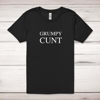Grumpy Cunt Adult T-Shirt\nA rude adult t-shirt with "Grumpy Cunt" printed across the front of a 100% cotton* t-shirt. This rude t-shirt is great as a gift for any occasion.\nAll of our adult t-shirts are designed and hand-printed in the UK and are manufactured from quality 100% pre-shrunk jersey cotton knit for substantial softness and comfort. When quality, durability and substance count, this is the tee everyone can agree on. Featuring a crew neck, short sleeves, twin needle sleeve and bottom hems and unisex sizing. Available in sizes Extra Small to 5XL*.\n *Black & White tees available in sizes XS - 5XL, all other colours available XS - 2XL \n\nSize Guide\nUnisex adult t-shirts are measured across the chest, in inches\n\n\nXS 30/32"\n\nS 34/36"\n\nM 38/40"\n\nL 42/44"\n\nXL 46/48"\n\n2XL 50/52"\n\n3XL 54/56"\n4XL 58/60"5XL 62/64"\n\nSee more on our clothing size guide (opens in new tab)\n\n\nPlease Note\nAll of our t-shirts are hand-printed to order, as a result, colours may vary between prints - images are for illustration purposes only.\n\n