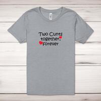 Two Cunts Together, Forever Adult T-Shirt\nA rude unisex adult t-shirt with "Two Cunts Together, Forever" printed across the front of a 100% cotton* t-shirt. This rude t-shirt is great as a gift for any occasion.\nAll of our adult t-shirts are designed and hand-printed in the UK and are manufactured from quality 100% pre-shrunk jersey cotton knit for substantial softness and comfort. When quality, durability and substance count, this is the tee everyone can agree on. Featuring a crew neck, short sleeves, twin needle sleeve and bottom hems and unisex sizing. Available in sizes Extra Small to 5XL*. *Black & White tees available in sizes XS - 5XL, all other colours available XS - 2XL \n\nSize Guide\nUnisex adult t-shirts are measured across the chest, in inches\n\nXS 30/32"\n S 34/36"\nM 38/40"\nL 42/44"\nXL 46/48"\n2XL 50/52"\n3XL 54/56"\n4XL 58/60"5XL 62/64"\n\n\nSee more on our clothing size guide (opens in new tab)\n\n\nPlease Note\nAll of our adult t-shirts are hand-printed to order, as a result, colours may vary between prints - images are for illustration purposes only.\n