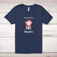 Merry Christmas... Swearing Adult T-Shirt\nA rude adult t-shirt with a fun Santa graphic and 'Merry Christmas ...", choose from bitch or wanker printed across the front of a 100% cotton* t-shirt. This rude t-shirt is great as a gift for any occasion.\nIf you would like a different swear word, add a note to your order with your preferred insult.\nAll of our adult t-shirts are designed and hand-printed in the UK and are manufactured from quality 100% pre-shrunk jersey cotton knit for substantial softness and comfort. When quality, durability and substance count, this is the tee everyone can agree on. Featuring a crew neck, short sleeves, twin needle sleeve and bottom hems and unisex sizing. Available in sizes Extra Small to 5XL*. *Black & White tees available in sizes XS - 5XL, all other colours available XS - 2XL \n\nSize Guide\nUnisex adult t-shirts are measured across the chest, in inches\n\nXS 30/32"\n S 34/36"\nM 38/40"\nL 42/44"\nXL 46/48"\n2XL 50/52"\n3XL 54/56"\n4XL 58/60"5XL 62/64"\n\n\nSee more on our clothing size guide (opens in new tab)\n\n\nPlease Note\nAll of our adult t-shirts are hand-printed to order, as a result, colours may vary between prints - images are for illustration purposes only.\n