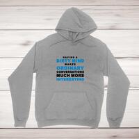 Having A Dirty Mind Hoodie\nA novelty hoodie with "Having A Dirty Mind Makes Ordinary Conversations Much More Interesting" printed on the front of a unisex pullover hooded sweatshirt. Simple and straight to the point this novelty hoodie is great as a\n gift for any occasion.\nComfortable and cosy, this hoodie manages to be both warm and cool. The super soft feel and plush fabric is\n definitely something you’ll want to warm up to. All of our garments are designed and hand-printed in the UK and are\n manufactured from preshrunk fleece knit and features a double-lined hood, and colour-matched drawcord, pouch pocket\n and a tubular body that has been quarter turned to avoid a centre crease; available in sizes small to 5XL.\n\n Classic fit\n Preshrunk fleece knit\n Air jet yarn = softer feel and reduced pilling\n Double-lined hood with colour-matched drawcord\n Pouch pocket\n Twin-needle stitching at shoulder, armhole, neck, waistband and cuffs\n 1 x 1 rib with elastane\n Quarter-turned to eliminate centre crease\n Material Weight 271gsm\n 50% Cotton / 50% Polyester\n\nSize Guide\nmeasured across the chest\n\n S 34/36"\n M 38/40"\n L 42/44"\n XL 46/48"\n 2XL 50/52"\n 3XL 54/56"\n 4XL 58/60"\n 5XL 62/64"\n\nSee more on our clothing size guide (opens in new tab)\n\n Please Note\n All of our items are hand-printed to order, as a result, colours may vary between prints - images are for\n illustration purposes only.\n