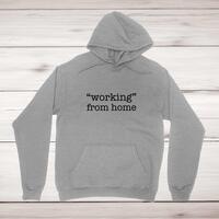 Working From Home Hoodie\nA novelty hoodie with "Working From Home" printed on the front of a unisex pullover hooded sweatshirt. Simple and straight to the point this novelty hoodie is great as a\n gift for any occasion.\nComfortable and cosy, this hoodie manages to be both warm and cool. The super soft feel and plush fabric is\n definitely something you’ll want to warm up to. All of our garments are designed and hand-printed in the UK and are\n manufactured from preshrunk fleece knit and features a double-lined hood, and colour-matched drawcord, pouch pocket\n and a tubular body that has been quarter turned to avoid a centre crease; available in sizes small to 5XL.\n\n Classic fit\n Preshrunk fleece knit\n Air jet yarn = softer feel and reduced pilling\n Double-lined hood with colour-matched drawcord\n Pouch pocket\n Twin-needle stitching at shoulder, armhole, neck, waistband and cuffs\n 1 x 1 rib with elastane\n Quarter-turned to eliminate centre crease\n Material Weight 271gsm\n 50% Cotton / 50% Polyester\n\nSize Guide\nmeasured across the chest\n\n \n S 34/36"\n \n M 38/40"\n \n L 42/44"\n \n XL 46/48"\n \n 2XL 50/52"\n \n 3XL 54/56"\n \n 4XL 58/60"\n \n 5XL 62/64"\n\nSee more on our clothing size guide (opens in new tab)\n\n Please Note\n All of our items are hand-printed to order, as a result, colours may vary between prints - images are for\n illustration purposes only.\n