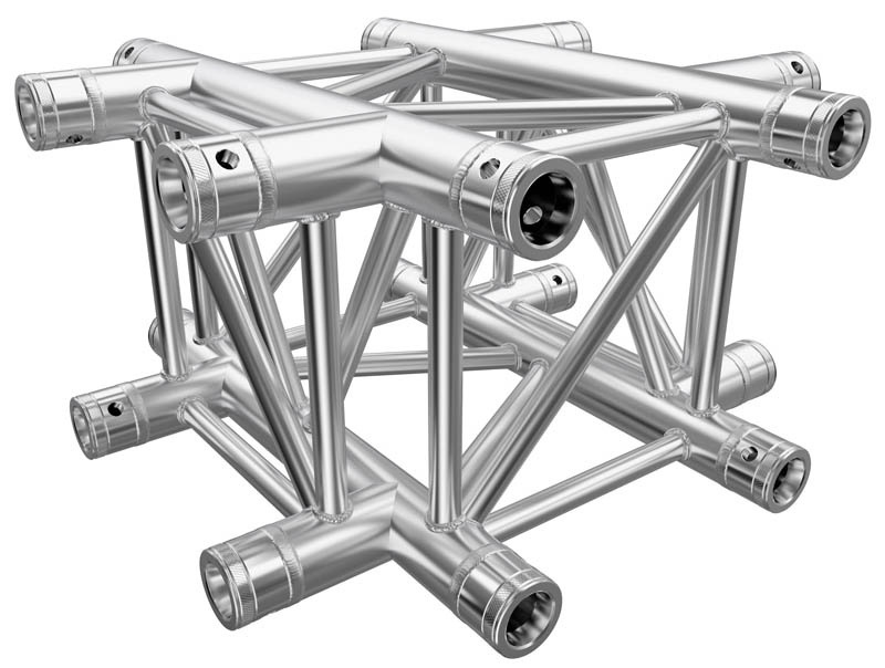 Quatro290 4 Way Cross. Aluminium- Black or White Finish. Supplied with 3 Connecting KitsSquare Size: 290 x 290mm Tube Size: 50mm Weight: 10.8Kg. The Quatro 290 Corner 3 way corner by Contestage is not only perfect for heavy-duty load-bearing structures but is also highly versatile- making it suitable for a wide range of applications. It is ideal for use in stages- theatres- exhibitions- rental companies- and shop displays- providing the strength and flexibility required for these demanding environments. Its easy-to-use conical connectors make assembly quick and straightforward- saving you valuable time and effort. Whether you need to set up a temporary stage for an event- create an exhibition display- or a retail shop display- the Quatro 290 corner 6 is the perfect choice for your needs. Invest in this high-quality product by Contestage and take your project to the next level. In addition to its versatility- the Quatro 290 Corner is also TUV- ensuring that it meets the highest safety and quality standards. It is made of 50mm aluminium alloy (EN AW 6082 T6)- with a tube diameter of 50mm and thickness of 2mm- making it durable and reliable for even the most challenging applications. Its robust construction and certification guarantee that you can trust it to support heavy loads safely and securely. Choose this Quatro 290 corner for your next project- and benefit from its strength- versatility- and certification.. truss-trussing-trussing corner-square truss