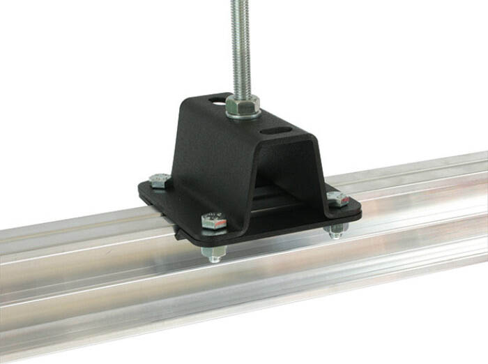 Adjustable Stud Hanger for Doughty Studio Rail 80. Supplied with Rail Clamps. Suitable for M10 & M12 Stud. Powder Coated Black FinishSafe Working Load: 100Kg Dimensions: 123 x 106 x 106mm Weight: 760g. A range of mild steel stud hangers supplied with rail clamps. These brackets are used to suspend Studio Rail from either an M10 or an M12 studding. Available in powder coated black.. studio rail adjustable stud hanger-studio rail 80 adjustable stud hanger-doughty studio rail 80