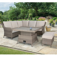 The Kettler Charlbury Signature Casual Dining Mini Corner Rattan Garden Furniture Set is perfect w hether you’re dining or lounging on the patio. The beautifully handwoven synthetic wicker keeps this Charlbury set weatherproof and UV protected, along with its aluminum frame keeping the set rigid and sturdy throughout the years. The included table stands at mid-height, making it a perfect set to dine and lounge around on, seating up to 6 people. Set Features Set includes left & right hand sofa, corner sofa, 85cm Bench, and height adjustable table Material: Aluminium frame with wicker 5mm full round wicker on the edges and sofa arms. 3mm horizontal flat wicker and 5mm vertical double half round wicker on the sides Weatherproof – leave outdoors all year round (excluding cushions) UV resistant Seats approx. 6 people Adjustable foot caps on the table 3 year warranty on the frame and 12 months warranty on the cushions (terms & conditions apply) Set Dimensions Left Sofa: 85cm (H) x 126cm (W) x 76cm (D) Right Sofa: 85cm (H) x 126cm (W) x 76cm (D) Sofa's Seat Height: 43cm Sofa's Arm Height: 63cm Corner Lounge Sofa: 85cm (H) x 76cm (W) 76cm (D) Height-Adjustable Table: Bench: 43cm (H) x 85cm (W) x 38cm (D) Bench's Seat Height: 33cm