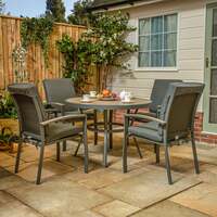 Featuring four high back armchairs and a 110cm round garden dining table , the LG Outdoor Monza Aluminium 4 Seat Cushioned Armchair Garden Furniture Dining Set is a modern outdoor dining set that would look great on your patio or in your garden. The chairs and table are made of grey aluminium , plus the chairs have a mixed textline seat and back with thick grey season-proof cushion s for added comfort with their soft-feeling fabric. This outdoor dining set is strong, light, and rust-resistant . It also requires little maintenance. Because the cushions are water-repellent and UV-resistant , they can be left outside and still retain their softness and comfort. The stunning wood-effect ceramic glass table top that has been inset into the table frame is the set's main focal point. While it has the appearance of wood, the table top is ideal for busy families because it does not require wood treatment. Care Instructions: To clean the furniture, use a mild detergent. Store indoors during the winter and in adverse weather for extra protection. Keep the cushions inside when not in use. They are only cleanable with a damp, soapy cloth and cannot be machine washed. Set Features Table top with inset wood-effect ceramic glass Aluminium framework with a double powder coat Includes Eden season-proof cushions Parasol not included Specifications Table Dimensions: 75cm (H) x 110cm (W) x 110cm (L) Chair(s) Dimensions: 97cm (H) x 60.5cm (W) x 68cm (L) Chair(s) Weight (kg): 6.7