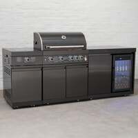 The Draco Grills Nero Modular Outdoor Kitchen is a luxury configuration that does it all! This Modular Outdoor Kitchen layout is just one of the limitless combinations to create a stunning outdoor cooking space. This Nero Outdoor Kitchen contains a Nero 4 burner BBQ, a Nero Sear Station and a Nero Single Fridge Unit. The smooth lines of the Black Stainless Steel give a sleek, modern look that will create an Outdoor Kitchen with style. Now with an extra-deep cabinet construction which gives even more worktop space and soft close doors for an added touch of class. A full 304 grade Black stainless steel construction finished with a stunning granite top. It is perfect for those seeking a quality, robust weather resistant kitchen. The Nero 4 Burner Barbecue comprises of a double skinned black stainless steel dome hood with 'cool to touch' technology, cast stainless steel "Power" burners give a consistent flame from front to back, providing even and efficient heat distribution, teamed with a ceramic infrared rear burner for perfect grilling. The burner controls have individual back light colour changing from white to red, indicating which burners are in use. The whole barbecue is constructed from high corrosion resistant solid 304 grade stainless to the burner box and framework. The barbecue can be converted to Natural Gas with a Draco Grills Outdoor Kitchen Natural Gas Conversion Kit (DRA9940) . Keeping with the quality materials, the single fridge cabinet is constructed from the same high grade 304 stainless steel to both externally and internally. With easy to use touch pad digital controls and fully adjustable shelves offering plenty of storage for drinks, the fridge is the perfect addition for any sophisticated outdoor kitchen. For optimal cooling, we advise keeping the fridge out of direct sunlight. It can be independently operated without having to open the door with temperatures between 2 and 10 degrees Celsius for the coldest of drinks on the warmest of days. Also included in this package is a Nero Sear Station, containing an Infra-Red burner that provides very high temperatures to sear anything you decide to cook on it in no time, providing even and efficient heat distribution with very high peak temperatures; all within a compact and solid 304 grade stainless steel frame. Like the barbecue, it. Draco Grills 4 Burner BBQ Black Stainless Steel Modular Outdoor Kitchen with Sear Station and Fridge Unit, Late April 2025 / With Side Panels