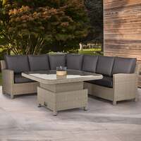 The Kettler Palma Signature Grande White Wash Wicker Corner Sofa Set with High/Low Glass Top Table is the perfect garden sofa set for maximum comfort whether you are lounging in the evening or having a formal dinner during the day. With room for up to 6 people there is plenty of space for eating, drinking, and lounging. The Palma Signature Grande Sofa is crafted from a weatherproof and UV protected synthetic wicker, which is handwoven onto a powder coated aluminium frame. This ensures the sofa is completely weather-resistant so you can keep it outdoors all year round. The table is constructed from a sturdy aluminium frame, synthetic weave and a glass table top. The high/low mechanism means you can enjoy your patio set relaxing around a coffee table in the low position, or lift it up for that alfresco dining experience outside with friends. The sofa comes equipped with thick cushions that boast an 8cm foam core and double piping, which provide the ultimate comfort and support. With two colour options available (Oyster or White Wash), this Kettler set of garden furniture will look at home in any setting. Set Features Includes: 1x left side sofa, 1x right side sofa, 1x corner sofa, 1 x high/low glass top table and cushions Powder coated aluminium frame Hand woven 6mm half round wicker Weatherproof and UV resistant 8mm foam core thick seat and back cushions with double piping Colour: White Wash 3 Year Warranty Set Dimensions Left Sofa Section: 88.5cm (H) x 129cm (W) x 79.5cm (D) Seat Height of Left Sofa Section: 39cm Arm Height of Left Sofa Section: 64cm Corner Section: 88.5cm (H) x 164.5cm (W) x 88.5cm (D) Seat Height of Corner Section: 39cm Arm Height of Corner Section: 64cm Right Sofa Section: 88.5cm (H) x 129cm (W) x 79.5cm (D) Seat Height of Right Sofa Section: 39cm Arm Height of Right Sofa Section: 64cm Table: 49cm/69cm (H) x 126cm (W) x 126cm (D)