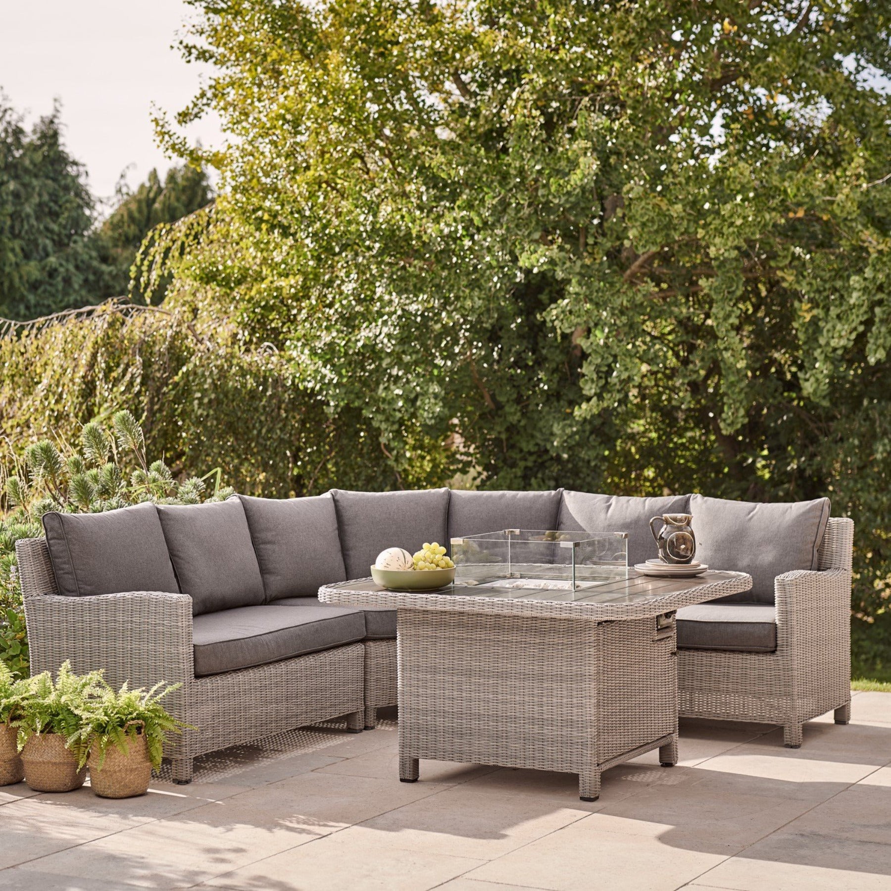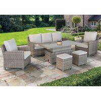 This Kettler Palma Signature Oyster Casual Dining Sofa Set includes the 3-seater outdoor sofa, height adjustable high/low glass top table, 2 armchairs, and comfy stools. The soft cushions of the outdoor corner sofa have a foam core. The amazing adjustable high low glass top table is simple to operate. Keep it low for a coffee table appearance, or raise it for a more formal outdoor dining experience. The Kettler Palma outdoor furniture line is made of handwoven weatherproof wicker that is wrapped around a strong aluminium frame . They are available in a choice of two colours: White Wash and Oyster. Set Features Set includes a 3 seater sofa, high low glass top table, 2 armchairs, and two stools Material: Aluminium square tube frame with 6mm half round wicker Weatherproof, UV resistant wicker – leave outdoors all year round (except cushions) Durable and long-lasting – built to the highest specification with extra supports along sofa Cushions included 8cm foam core seat cushions Double piped back cushions for additional support Stain resistant cushions with shower resistance – we advise taking cushions indoors when not in use Seats 7 people (approx.) 3-year warranty Colour: Oyster Set Dimensions Sofa: 85cm (H) x 190cm (W) x 80cm (D) Sofa's Seat Height: 48cm Sofa's Arm Height: 64cm Stool(s): 48cm (H) x 38cm (W) x 38cm (D) Stools' Seat Height: 48cm Armchair(s): 85cm (H) x 74cm (W) x 80cm (D) Armchairs' Seat Height: 48cm Armchairs' Arm Height: 64cm Table: 49/69cm (H) x 145cm (W) x 81cm (D)