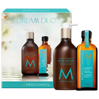 The Moroccanoil Treatment with Body Lotion Set Dream Duo comprises two argan oil-based formulations, combining the signature Moroccanoil Original Treatment Oil for hair with a Moroccanoil Body Lotion.\nBoth products are enriched with a Mediterranean-inspired scent, featuring subtle accords of amber and floral blossoms to invigorate your senses.\nIt’s a haircare and body set featuring a nourishing hair oil treatment and body lotion. Care for your hair and your skin with the Moroccanoil Treatment with Body Lotion Set. Including two argan oil-powered formulas, the set features the iconic Moroccanoil Treatment Oil and a Moroccanoil Body Lotion. Both are enriched with the brand’s unique Mediterranean-inspired scent, featuring spicy notes of amber and flower blossoms to engage your senses.\nSet Contents:\nMoroccanoil Treatment 100ml\n\nAchieve silky-feeling, shiny-looking hair with the oil-infused haircare treatment. The best-selling formula is powered by rich argan oil, which enriches the hair with nourishing hydration and protective antioxidants. Hair feels more manageable and appears smoother after use.\n\nBody Lotion 360ml\n\nNourish your skin with the ultra-light, fast-absorbing body cream. Featuring a blend of conditioning oils, such as argan and evening primrose, the formula helps to soften skin for a radiant, smoother look. The moisturiser boasts soothing properties with aloe leaf extract working to hydrate the skin.\n\n