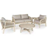 The beautifully elegant Kettler Cora 2 Seat Lounge Sofa Set with Armchairs and Coffee Table seats up to 4 people, making it perfect for sitting and relaxing with the family. It combines a white smoke coloured FSC-certified acacia wood frame with a stunning weatherproof and UV resistant hand woven synthetic rope back and sides, plus comes complete with natural coloured cushions. This set will look at home on the patio, decking or even pop it inside to brighten up your conservatory. Set Features Set includes 1x 2-seater sofa, 2 x Lounge Armchairs and 1 x 90cm Round Coffee Table Material: FSC Certified Acacia Frame with hand woven synthetic rope Showerproof cushions- We would recommend storing these inside when not in use Seats up to 4 people (approx.) 3-year warranty ( 1 year warranty on cushions) Set Dimensions 2-Seater sofa: 68.5cm (H) x 151cm (W) x 72.5cm (D) Lounge Armchair: 68.5cm (H) x 68cm (W) x 72.5cm (D) Coffee Table: 90cm Diameter x 38.8cm (H)