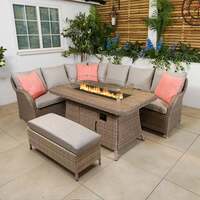 With this chic Monte Carlo Sand Fire Pit Set by LG Outdoor, you may relaxing in the sun or enjoy a nice hot or cold drink. It offers a pleasant area to take in the scenery or spend quality time with the family. This set includes a gas fire pit table, a long stool, and a modern corner sofa. Providing ample seating for up to 8 people, the set has a classic natural colour scheme and the Sand-coloured Everweave is fashioned with conventional round backs for an incredibly comfortable seating experience. It includes substantial, all-season seat and back cushions that can be left outside during the summer (bring in for the winter). They are shielded by Stainsafe technology, which offers a water-repellent, UV-resistant, and quick-drying finish. In addition to the stunning design of this set that is sure to become a central focus in your garden when entertaining guests or experiencing al fresco dining, this Monte Carlo set has a reclining corner section which gives you an extra bit of luxury! The big rectangular table has lots of room for you to place drinks and snacks. The table's wood-effect ceramic-coated glass top, together with its big gas fire pit and glass surround, are its standout features. Its exquisite design will boost your outdoor space. You can extend your get-togethers and spend more time outside as the fire pit provides warmth on those chilly summer days. It is durable and simple to clean as needed, making it ideal for usage throughout the summer. The Monte Carlo garden furniture collection, expertly built with durable aluminium and multi-toned Everweave with braided detail, offers classic elegance that will go well in any outdoor setting. What's Included Modular Left & Right Sofa with Cushions Reclining Corner Sofa, Middle Sofa with Cushions Double Footstool Rectangular Gas Firepit Table Features Sand colourway Seasonproof seat and back cushions Durable weave on an aluminium frame Reclining corner sofa Ceramic wood-effect glass top Simple assembly 3 year manufacturer's warranty Dimensions Sofa: 81cm (H) x 244cm (W) x 76cm (D) Stool: 35cm (H) x 80cm (W) x 42cm (D) Table: 68cm (H) x 120cm (W) x 120cm (D)