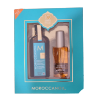 Give yourself a deeply nourishing, head-to-toe treatment with the Moroccanoil 10 Year Special Edition; a duo of Argan Oil-infused oils for the hair and body that deeply moisturises, conditions and softens locks and skin. To celebrate the decade-long journey of the brand that pioneered oil-infused hair care and created the global buzz on Argan Oil, the set arrives in a sleek gift box in Moroccanoil’s signature turquoise and gold hues.\nThe Moroccanoil Treatment 100ml + DRY Body Oil 50ml Set Contains:\n\nMoroccanoil Treatment – Original (100ml)\n\nA luxurious formula that works to renew and repair dry, damaged hair. Harnessing the powers of antioxidant-rich Argan Oil and shine-enhancing vitamins, the nourishing formula helps to strengthen and fortify strands, whilst fighting frizz and effectively detangling for a salon-worthy finish. Expect calm, manageable locks with revived radiance and vitality.\n\n \n\nDry Body Oil (50ml)\n\nA weightless, nourishing oil infused with the signature Moroccanoil aroma that quickly melts into skin, locking in moisture and improving skin tone and texture for instantly hydrated, silky-soft skin. Saturating skin with the nourishing, antioxidant properties of Argan Oil, the dry body oil penetrates skin with a nutritive cocktail of essential fatty acids and natural oils extracted from Olive and Avocado.\n\n