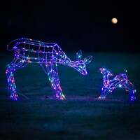 The Christmas Centre's White Wire Light Up Christmas Reindeer Mother & Baby will look great in any home's festive display either indoors or outdoors. These beautiful, white wire reindeers stand at 100cm and 40cm tall and have 250 LED Warm White and Multi-Coloured lights between them. Twelve white pegs are included to attach both deer to the lawn to keep them from falling over. The 10m lead cable provides enough length to reach your nearest electric socket. Lighting Options Warm White with 10% Bright White twinkling bulbs Multi-Coloured with 10% Bright White twinkling bulbs Features & Specifications Height: 100cm (mother) and 40cm (baby) Material: White wire Frame Colour: White Contains 2 lighting colour options (Warm White and Multicoloured) 8 hour timer (16 hours off) 12 White ground pegs and 6 White cable ties included 250 Warm White and Multicoloured LED lights Can be used indoors or outdoors 10m transparent lead cable