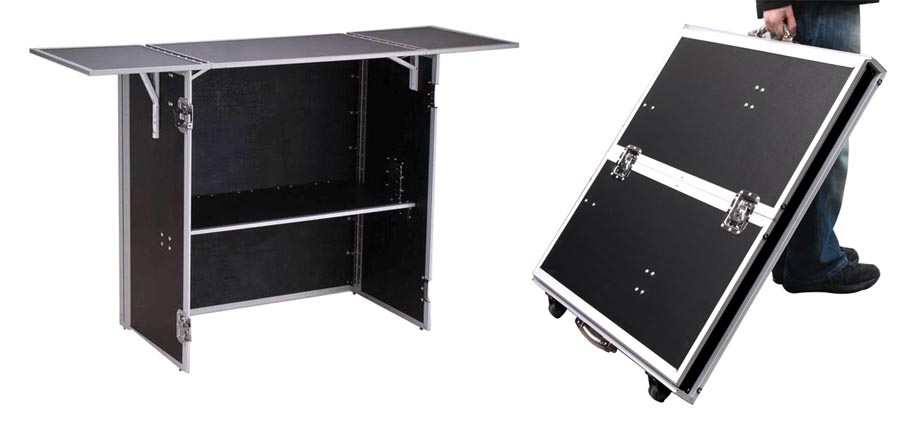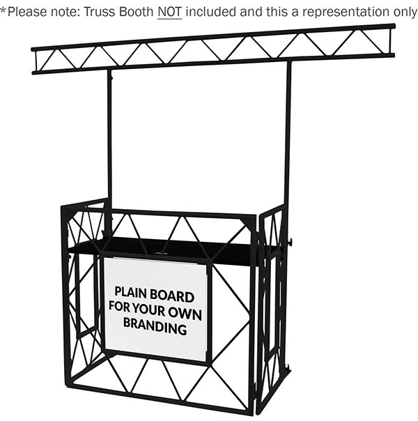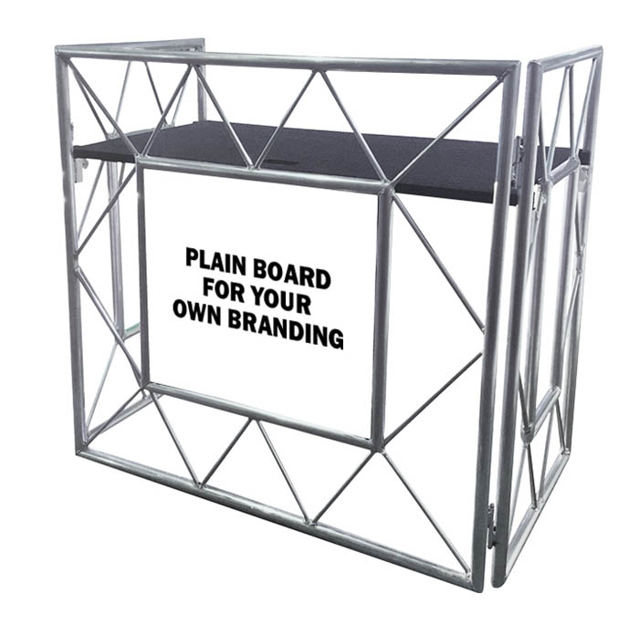 Large Foldable DJ Booth. Built-In Cable Management. Quick & Easy to Assemble. Lightweight Design. Supplied with Black & White Scrims. Carry Bags IncludedWorking Height: 885mm Dimensions (Assembled): 1300 x 2015 x 735mm Dimensions (Folded): 1320 x 190 x 970mm Weight: 27.5Kg. Introducing the Ultimax DJ XL Booth Pro. This ultra lightweight extra large aluminium DJ Booth system comes supplied with a metal shelf- carry bag and heavy duty white and black Lycra covers. You can create a nice effect by positioning a LED effect or batten light behind the white Lycra cloth. This booth is quick to build and even quicker to fold down. The supplied bag makes for easy storage and transportation. Perfect for mobile DJs- corporate events and weddings.. dj booth-dj stand