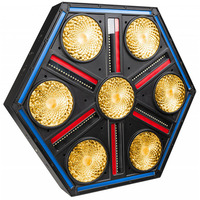 Hexagonal Multi Effect Fixture. Blinder- Strobe & RGB Pixel Mapping Effects. Full Pixel Control via Art-Net- sACN or DMX Controlled. Multiple DMX Channel Options. Quick Lock System for Easily Mounting Multiple Units Together in an Attractive Grid. 3 & 5pin DMX In/Out + RJ45 In/Out. Easy Software Upgrades via the RJ45 Network InputPower Supply: 100-240Vac- 50/60Hz Power Consumption: 1400W Blinder LED: 7 x 80W Warm White + Amber Strobe LED: 120 x 3W White RGB Section LED: 604 x 0.5W RGB DMX Channels: 12- 15- 31- 36- 37- 130- 169- 196 or 1952 Dimensions: 630 x 546 x 85mm Weight: 13.8Kg. This impressive projector is developed for use on concert stages- TV-studios and many more applications. It features a hexagonal multi-effect fixture with blinder- strobe- and RGB pixel mapping effects all-in-one. It includes 7 powerful 80W WW+A COB LEDs behind beautiful flower lenses- which emulate powerful classic tungsten blinders. Additionally- there are 6 powerful strobe lines with a total of 120 individual addressable high-efficiency 3W white LEDs. The extensive RGB section comprises 604 individually addressable 0.5W RGB LEDs divided into 3 zones- where RGB LEDs behind the blinder lenses create stunning and dynamic aura effects. There are 6 dynamic RGB pixel lines that mark the contours of the effect projector- along with 6 additional RGB pixel lines that create amazing star-shaped effects. Full pixel control is available via Art-Net or sACN- or through the internal DMX-controlled effects engine. The projector uses 12- 15- 31- 36- 37- 130- 169- 196- or 1952 DMX channels- with RDM functionality for easy remote setup. The LED refresh rate is selectable between 1200Hz and 25000Hz. It features a quick lock system for easily mounting multiple units together in an attractive grid. Connectivity options include 3 and 5-pin DMX in/out and RJ45 in/out. It also supports Seetronic IP65 True1 compatible power in/outputs- and easy software upgrades can be performed using the RJ45 network input. The projector is designed for use with optional omega brackets sold separately.. led effect light-multi effect light-disco effect-stage blinder