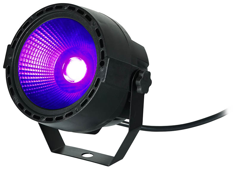 200W UV COB LED. 80 Degree Beam Angle with 25- 40 and 50 Degree Beam Reduction Lenses Included. DMX Controllable via 1 or 2 Channels. Manual Dimming Mode via Rotary Control or Menu. Bracket allows for Multiple Rigging or Floor Standing Applications. Quick Release Omega Clamp Included. PowerTwist TR1 & 3/5 Pin DMX Input/OutputPower Supply: 100-240Vac- 50/60Hz Power Consumtpion: 206W LED: 1 x 200W COB Beam Angle: 80 Degree (Native) with 25- 40 & 50 Degree Lenses Included DMX Channels: 1 or 2 Dimensions: 287 x 266 x 276mm Weight: 4.3Kg. The LEDJ 200W UV COB Par is a sleek and powerful lighting fixture loaded with a COB LED for high-output washes producing strong blacklight effects. It features an 80ø beam angle and includes three interchangeable beam reduction lenses (25ø- 40ø- and 50ø). This fixture has been designed to fill a variety of venues with a phenomenal UV glow.. uv par can-uv flood light-uv stage light