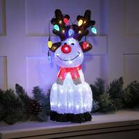 This cute festive Reindeer has got in a tangle with the lights! It is made from Acrylic and has 50 white LED lights, plus an additional 8 multicoloured bulbs in the light string. The timer allows you to set your lights to come on for 6 hours and stay off for 18 hours. Features & Specifications Height: 50cm 50 White LEDs and 8 Multi-Coloured LEDs 10m Lead Cable Suitable for indoor and outdoor use Timer - 6 hours on, 18 hours off
