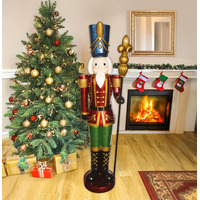 Constructed from durable polyresin, this Red, Green and Gold Pre-Lit LED Christmas Nutcracker Soldier from The Christmas Centre is based on the traditional German wooden Nutcrackers. It can be used indoors or outdoors. Placed next to your fireplace or as a guard at your front door, it will look amazing. With its lovely warm white LED lights in his red/gold jacket and blue/gold hat, this giant nutcracker is a wonderful addition to any festive display. Three AA batteries need to be used to light him up (not included). It has a timer as well, which initiates as soon as the nutcracker soldier is powered on. After 6 hours of use, it will shut off for 18 hours. Anywhere you place him, this tall nutcracker will proud with his amazing top hat and golden staff. Features Lifesize nutcracker (156cm tall) Traditional design Suitable for indoor and outdoor use Static warm white LED lights Built-in timer (6 hours on, 18 hours off) 3x AA batteries required - NOT INCLUDED Specifications Colour(s): Red, green, and gold Material(s): Polyresin, fibre glass No. of LED Lights: 16 Dimensions: 45.5cm (L) x 34.5cm (W) x 156cm (H) Weight (kg): 10