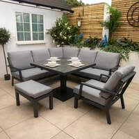 The Miami Dark Aluminium Compact Corner Dining Set with Adjustable Table, Bench, and Armchair by Bracken Outdoors is a fashionable casual dining set with a distinctive twist. The compact corner sofa, bench, and armchair offer plenty of room for you and your guests to relax. The major feature of this outdoor furniture set is the height-adjustable table, which not only provides dining space but also adds a unique element to the furniture, providing a different setting for your garden. Furthermore, it is simple to transition between a low-lounge type table and a high dining-height table. This set includes anthracite cushions and an aluminium frame with a weatherproof coating. Although the cushions are showerproof, we recommend removing them from the furniture and storing them somewhere dry during prolonged rain showers. The Bracken Outdoors Miami line has sleek, contemporary lounge sets that are both elegant and durable, making them perfect focal points in any outdoor setting. Set Features 5 Seater Sofa Separate Armchair Compact 1 Seater Stool Height Adjustable table Strong, lightweight aluminium frame Deep filled cushions Easy to clean Can be left outside all year with little maintenance (except for cushions) 5 year limited manufacturer warranty Assembly required Set Dimensions Recommended Footprint: 370cm x 200cm Sofa: 77cm (H) x 88cm (D) x 223cm (W) Table: 68cm (H) x 95cm (W) Table Top Glass Thickness: 8mm Small Stool: 40cm (D) x 60cm (W) Armchair: 77cm (H) x D: 88cm (D) x 75cm (W) Product Care Cleanin During the winter months you will find your aluminium frames will collect dust and dirt if exposed outside or kept in storage. Our frames can easily be cleaned with warm soapy water and a sponge, then rinsed with a hose (leave to air dry or towel dry). Do not pressure wash! Any bird droppings or other stuck on stains, Do Not use any hard abrasive cleaners, a metal wool scouring pad may remove the powder coating. Cushions that get soaked through are prone to minor mould growth, the covers can be removed and gently washed with hot, soapy water and non-bleach based furniture cleaner, leave to dry fully. Do not machine wash or tumble dry. The glass similar to the aluminium frame is likely to collect dirt or dust, this may also get water drying marks; this can be cleaned with any household window cleaner and wiped dry of any residue. Do not clean the firepit glass immediately after use, allow the table and glass to fully cool (if purchasing an applicable set) Long Term Care Over the usage life of this product, minor chips on the powder coating caused by moving the furniture etc are possible. To prevent water ingress flaking away more coating, you can seal the chip with an appropriately coloured outdoor metal paint.