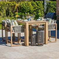 Bring style and comfort to your outdoor space with the Burford FSC Acacia and Rope Rectangular 4 Seat Garden Furniture Bar Set . This modern yet timeless set features a sturdy acacia wood frame, known for its durability and beautiful grain, paired with elegant woven rope detailing that adds a touch of texture and sophistication. The rectangular bar table offers a generous surface for drinks, snacks, and meals, while the four comfortable bar stools provide the perfect seating for you and your guests to relax in style. The wood has been treated to a light grey wash to ensure durability and a long-lasting, high-quality finish. This beautiful finish showcases the natural grain and texture of the wood while providing a soft, weathered look that effortlessly complements both contemporary and classic décor. The grey wash offers a subtle yet striking contrast, enhancing the wood’s natural beauty with a modern, muted tone that adds depth and character to any setting. The acacia wood is naturally weather-resistant, ensuring this set will stand up to the elements and remain a stunning feature in your garden, patio, or terrace for years to come. Whether you're hosting a small gathering, enjoying a quiet moment, or entertaining friends, this versatile wooden garden bar set is perfect for all occasions. The combination of acacia wood and rope creates a balanced, contemporary look that will complement any outdoor decor. Each cushion is made from quality fabric to provide a touch of elegance and exceptional comfort and support. Whether you’re curling up with a good book or entertaining guests, their soft yet firm construction ensures you’ll enjoy luxurious relaxation at every turn. Cushions can be cleaned with a damp cloth. Built for both comfort and long-lasting performance, this bar table and bar stool set is the ideal addition to your outdoor living area, providing both elegance and functionality in a sleek, space-saving design. Perfect for anyone looking to elevate their outdoor experience with a touch of luxury. Bracken Outdoors 1 Litre Teak Shield is an excellent solution for maintaining this garden furniture set. Apply gently from day 1 to protect the wood. Avoid rope areas during application. For best results, reapply 3 - 4 times a year. This water-based treatment allows the wood to breathe, creating a fine silicone layer that prevents long-term damage without fully sealing the wood. Following these simple steps will help preserve the beauty of your outdoor bar set for years! Set Features 4x Acacia hardwood with light grey wash and rope bar chairs/stools with grey cushions 1x Acacia hard wood with light grey wash 180cm x 100cm rectangular high dining/bar table Showerproof cushions Warranty: 3 years Set Dimensions Recommended Footprint: 400cm x 300cm Chair(s): 61cm (L) x 62cm (D) x 97.4cm (H) Table: 180cm (L) x 100cm (D) x 95cm (H)