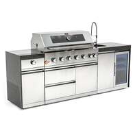 Host family and friends in style with the opulent Draco Grills 6 Burner BBQ Modular Outdoor Kitchen with Sear Station, Sink and Fridge Unit . A double-skinned stainless steel hood, stainless steel tubular burners, and a sturdy galvanised frame make up the grill of the Z640 6 Burner Gas BBQ. This premium gas barbecue is perfect for anyone looking for a grill for their garden that is both aesthetically pleasing and useful. It can be converted to Natural Gas using a Draco Grills Outdoor Kitchen Natural Gas Conversion Kit (DRA9941). Paired with the Draco Grills Sear Station, which serves as both a sear station for flawlessly searing steaks and a side burner for sauces and stir fries. Like the barbecue, it can also be converted to Natural Gas using a Draco Grills Outdoor Kitchen Natural Gas Conversion Kit (DRA9946). The Draco Grills Sink & Single Fridge Unit, which features a granite work surface and is composed of stainless steel with a brush finish, is also included with this outdoor BBQ kitchen kit. For optimum cooling, it is recommended the fridge is positioned out of direct sunlight. Please Note: The granite side panels are an added extra for this kit and can be selected via the drop-down menu, without these the kit will have stainless steel sides! A BBQ griddle is also not included with this package, but is available as an optional extra. Don't forget to look at our other straight run and L-shape options if this Modular Outdoor Kitchen does not meet your needs. 6 Burner BBQ Features & Specifications Stainless steel hood (double skinned) 430 commercial grade stainless steel Six stainless steel tubular burners Stainless steel fascia panel Infra-red back burner LED Lights Fold-down side shelves Stainless steel cooking grills Double drawer roller system 1 cupboard and 2 drawers underneath the BBQ Can be converted to Natural Gas using a conversion kit Hidden locking caster wheels Cooking Area: 43 x 97cm Total Heat Output: 90000 BTU (12,500 BTU per main burner, 15,000 BTU for rear burner, so total is 12,500 x 6 +15,000 = 90,000 BTU) 5 year limited warranty Dimensions: 119cm (H) x 110cm (W - exc. shelves) & 191cm (W - inc. shelves) x 57.5cm (D - exc. hood and controls which protrude) & 68cm (D - when hood is open) Sink & Fridge Unit Features & Specifications IPX4 water resistant 430 commercial grade stainless steel 40mm thick insulation 60L capacity fridge Fridge Temperature Range: 2 - 10 °C Designed and tested for scorching heat environments Insulated double-glazed doors with 304-grade stainless steel frames, designed to eliminate condensation Digital adjustable thermostat for temperature control Fridge has blue interior LED lighting Sturdy stainless steel handle 3 adjustable shelves in the fridge Hidden locking castor wheels with built in feet for levelling Granite worktop Fridge is lockable 37Db (when compressor is running) Fridge & Granite Top - 1 year limited warranty Cabinet - 2 year limited warranty Sink - 2 year limited warranty Energy Efficiency Ratin G Dimensions: 152cm (H - including the tap) and 90cm (H - to the top of the unit) x 96cm (W) x 57.5cm (D) Sear Station Features & Specifications 430 commercial grade stainless steel Stainless steel cooking grills 1 cupboard Hidden locking caster wheels Can be converted to Natural Gas using a conversion kit Total Heat Output: 13,300 BTU Warranty: 5 years (burner valve), 2 years (cabinet), and 1 year (granite top, burner, grill, and piezo ignition) Dimensions: 90cm (H) x 48.5cm (W) x 57.5cm (D) Overall Kitchen Dimensions Height : 154cm Width: 254.5cm Depth: 57.5cm (excluding hood and controls which protrude) . Draco Grills 6 Burner BBQ Modular Outdoor Kitchen with Sear Station, Sink and Fridge Unit, Mid June 2025 / With Granite Side Panels