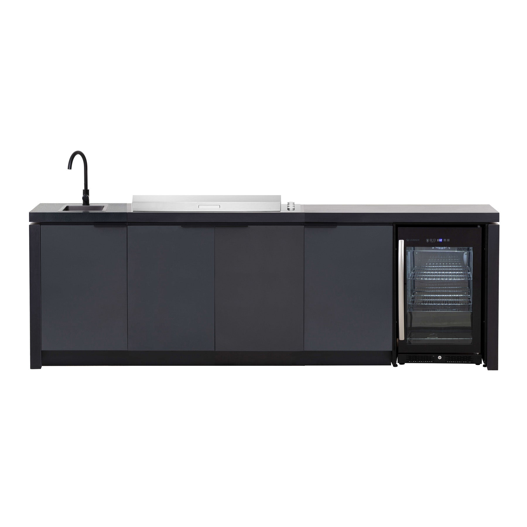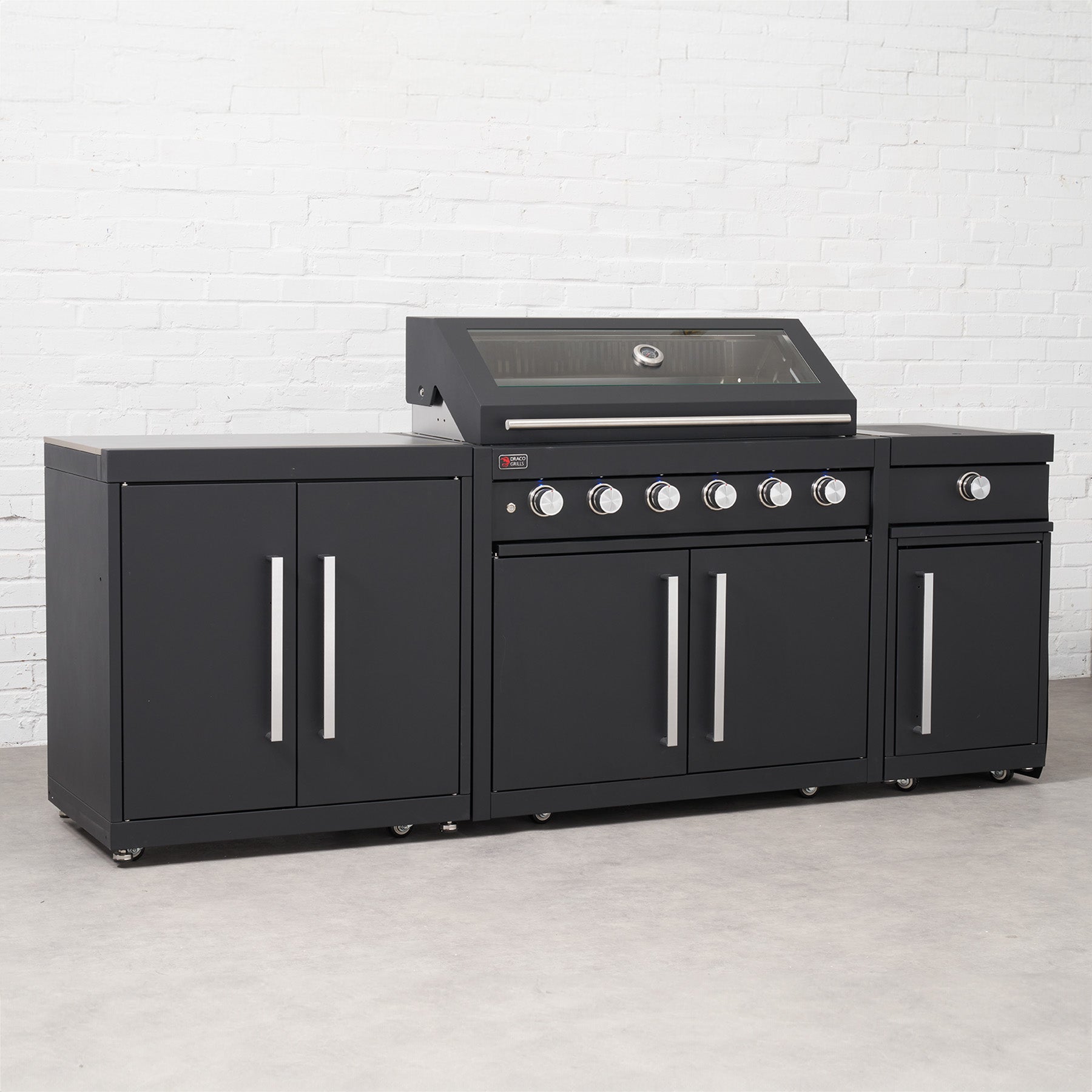 Entertain family & friends in style with a Draco Grills 6 Burner BBQ Modular Outdoor Kitchen with Sear Station and Double Fridge Unit . It is perfect for those seeking simple sophistication in the garden - something that is great to look at and even better to cook on! The Draco Grills Z640 6 Burner Gas BBQ will look fantastic in your garden. The grill comprises a double skinned stainless steel hood, stainless steel tubular burners and a solid galvanised frame. It can be converted to Natural Gas using a Draco Grills Outdoor Kitchen Natural Gas Conversion Kit (DRA9941). This outdoor kitchen package also comes with the Draco Grills Sear Station, which c an be used as a side burner for sauces and stir fries or as a sear station for cooking your steaks to perfection. Like the barbecue, it can also be converted to Natural Gas using a Draco Grills Outdoor Kitchen Natural Gas Conversion Kit (DRA9946). With a temperature range of 0 -10 degrees Celsius and large capacity, the Draco Grills Double Fridge is the perfect place to keep your drinks nice & cool. For optimum cooling, it is recommended that the fridge is kept out of direct sunlight. Please Note: The granite side panels are an added extra for this kit and can be selected via the drop-down menu, without these the kit will have stainless steel sides! A BBQ griddle is not included with this package, but is available as an optional extra. 6 Burner BBQ Features & Specifications Stainless steel hood (double skinned) 430 commercial grade stainless steel Six stainless steel tubular burners Stainless steel fascia panel Infra-red back burner LED Lights Fold-down side shelves Stainless steel cooking grills Stainless Steel Sear Station Double drawer roller system 1 cupboard and 2 drawers underneath the BBQ Can be converted to Natural Gas using a conversion kit Hidden locking caster wheels Cooking Area: 43cm x 97cm Total Heat Output: 90,000 BTU (12,500 BTU per main burner, 15,000 BTU for rear burner, so total is 12,500 x 6 + 15,000 = 90,000 BTU) 5 year limited warranty Dimensions: 119cm (H) x 110cm (W - exc. shelves) & 191cm (W - inc. shelves) x 57.5cm (D - exc. hood and controls which protrude) & 68cm (D - when hood is open) Double Fridge Features & Specifications Designed for outdoor installation – Ipx4 rated 40mm thick insulation Temperature range of this fridge is 0 - 10 degrees Designed and tested for scorching heat environments Insulated double-glazed doors with 304 grade stainless steel frames, designed to eliminate condensation Fan assisted frost-free system delivering consistent temperature throughout Digital adjustable thermostat for temperature control Sturdy handles Warranty: 2 years (cabinet) and 1 year (fridges and granite top) Energy Efficiency Ratin F Energy Consumption: 657 kWh/annum Dimensions: 90cm (H) x 96cm (W) x 57.5cm (D) Sear Station Features & Specifications 430 commercial grade stainless steel Stainless steel cooking grills 1 cupboard Hidden locking caster wheels Can be converted to Natural Gas using a conversion kit Total Heat Output: 13,300 BTU Warranty: 5 years (burner valve), 2 years (cabinet), and 1 year (granite top, burner, grill, and piezo ignition) Dimensions: 90cm (H) x 48.5cm (W) x 57.5cm (D) Overall Kitchen Dimensions Height: 119cm Width: 254.5cm Depth: 57.5cm (exc. hood and controls which protrude) If this Outdoor BBQ Kitchen does not fit your needs, don't forget to check out our other straight run and L shape options. . Draco Grills 6 Burner BBQ Modular Outdoor Kitchen with Sear Station and Double Fridge Unit, Mid June 2025 / Without Granite Side Panels