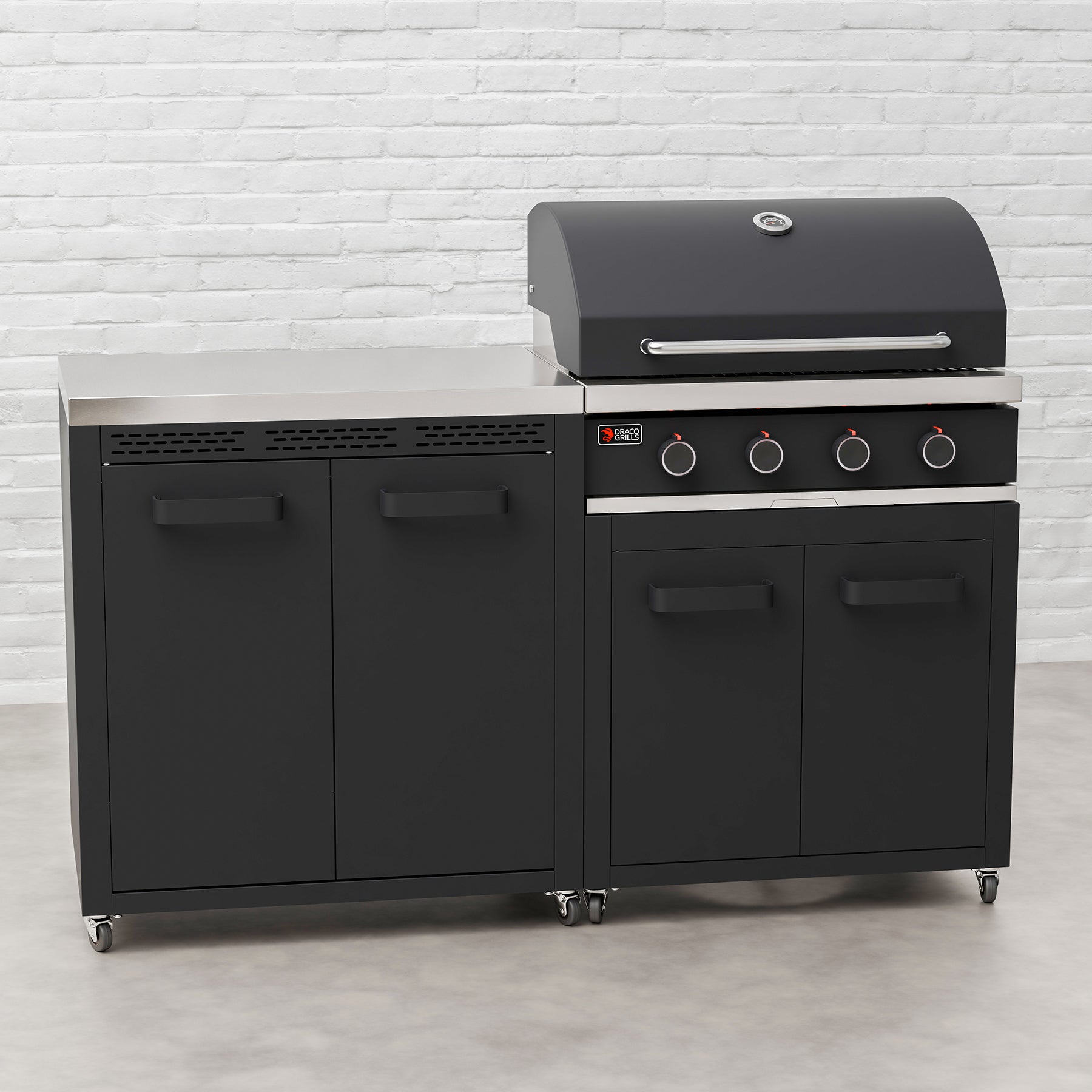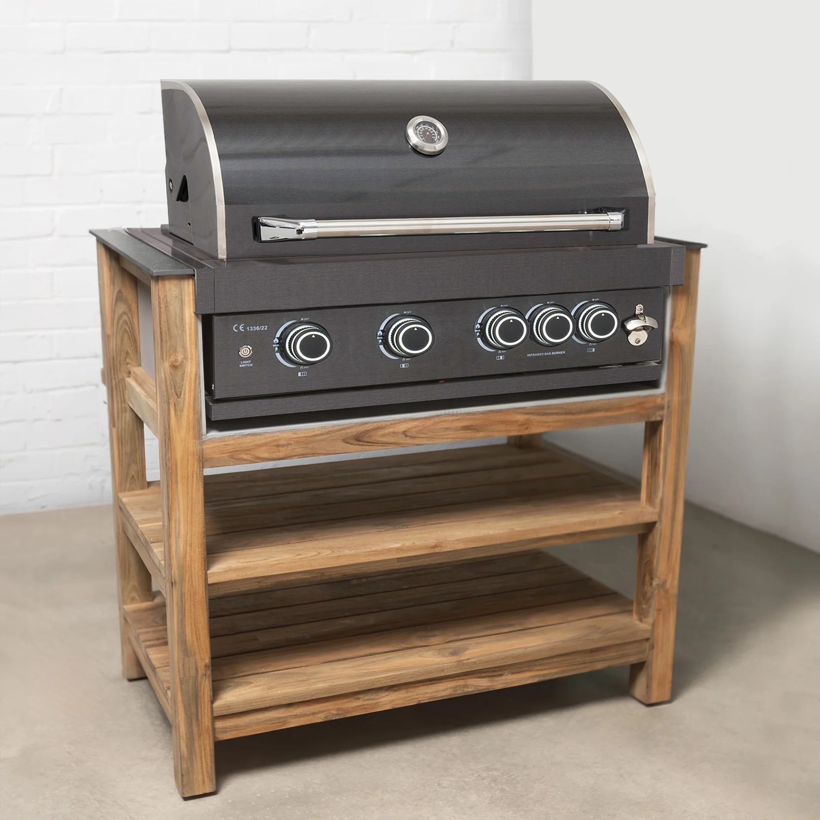 This Draco Grills Teak Outdoor Kitchen is ideal for those who frequently entertain outside or who enjoy throwing parties on occasion. It comes with a 4 burner BBQ placed on a housing unit, single cupboard, and triple drawer unit. This outdoor cooking area will look wonderful in your garden because of the rustic combination of reclaimed Teak and ceramic counters. It also includes the fundamentals for cooking and entertaining for small to medium gatherings. This outdoor kitchen, built entirely out of reclaimed Teak and finished with a nice Dark Stone Ceramic worktop, has plenty of space, making it great for people wanting simple sophistication in their garden. The Draco Grills Z440B 4 Burner Gas BBQ is made of 304 grade stainless steel. The grill features a stainless steel hood and burners. It may be converted to Natural Gas using a Draco Grills Outdoor Kitchen Natural Gas Conversion Kit (DRA9940). Optional upgrades for this BBQ include a Rotisserie and Charcoal Tray (sold separately). The single cupboard can be used as a gas bottle holder cabinet. It comes complete with vented grills and an exit hole for the gas pipe to the nearby BBQ unit. The other cabinet in this set features three soft close drawers that can store a variety of objects. It, like the other items, is built with a sturdy reclaimed Teak frame and a nice Dark Stone Ceramic top. Draco Grills' Teak series is made composed of reclaimed Teak, making each panel, frame, and unit is unique! The reclaimed Teak's flowing grain lines provide a clean, contemporary style, resulting in a fashionable outdoor kitchen. It's visually stunning and will surely serve as the centrepiece of your outdoor space. This line contains additional modular units and optional matching stone side panels (see drop-down menu). Items Included 4 Burner Gas BBQ with housing unit Single Cupboard Triple Drawer Unit Draco Grills' Teak Outdoor Kitchens are manufactured entirely of reclaimed Teak. It needs little upkeep due to its high concentration of natural oils and minerals, which protect it from water, rot, insect infestation, fungal decay, and mildew. With care and attention, your Teak kitchen will last for many years. Teak is a natural material; therefore, variations in colour, texture,. Draco Grills Teak 4 Burner Outdoor Kitchen with Modular Single Cupboard and Triple Drawer Unit, Mid June 2025 / Without Side Panels