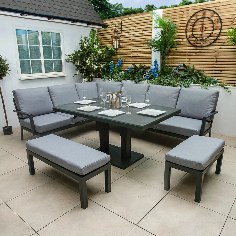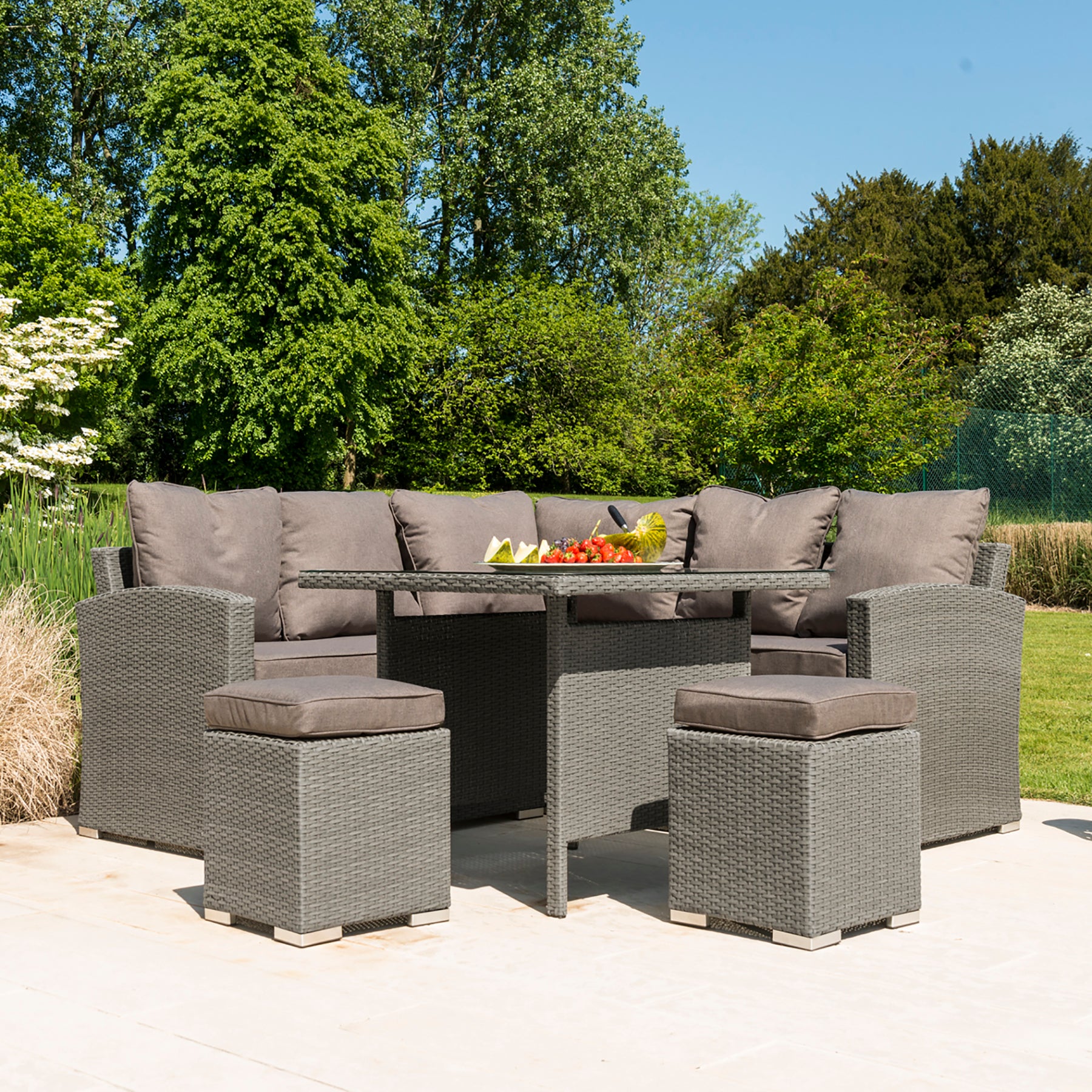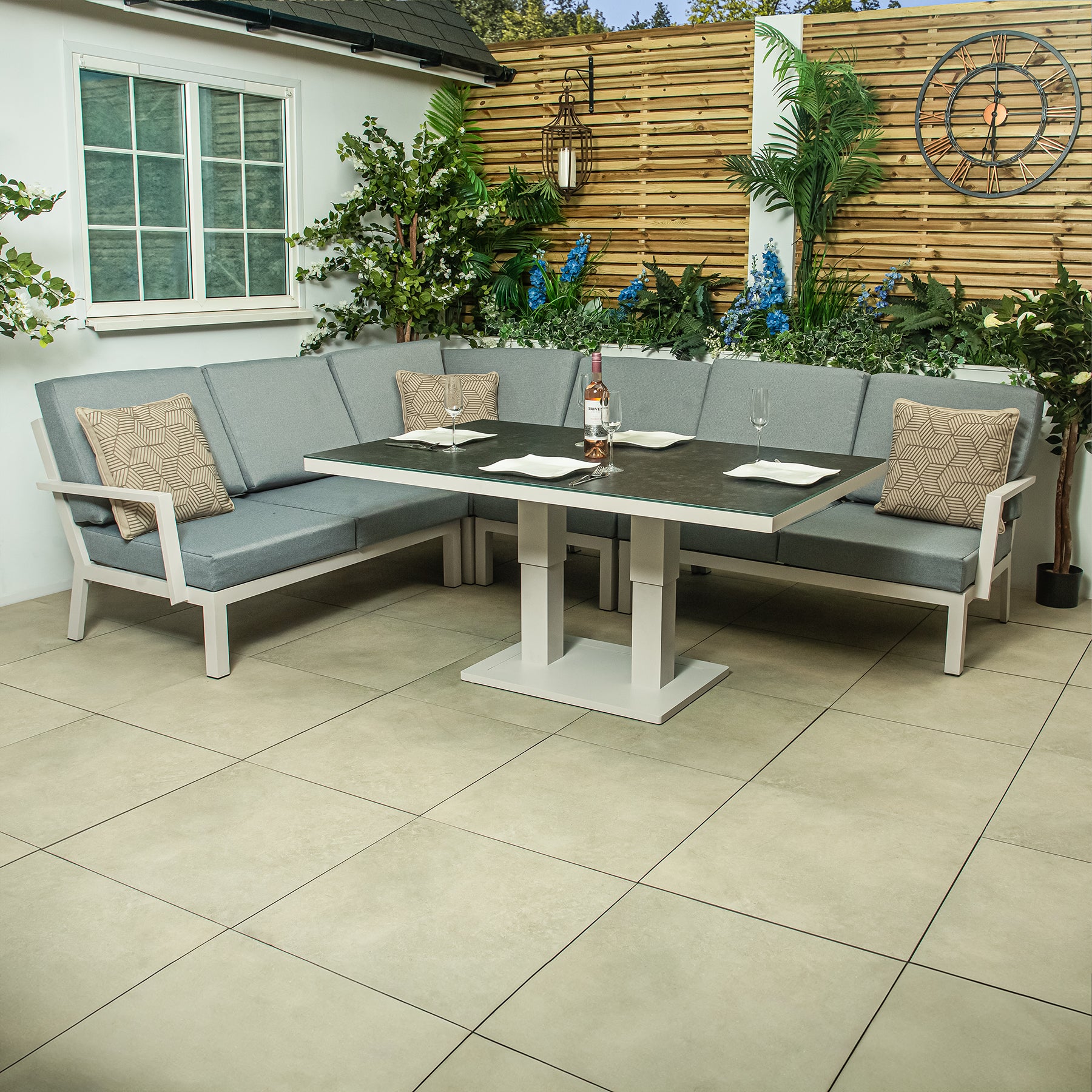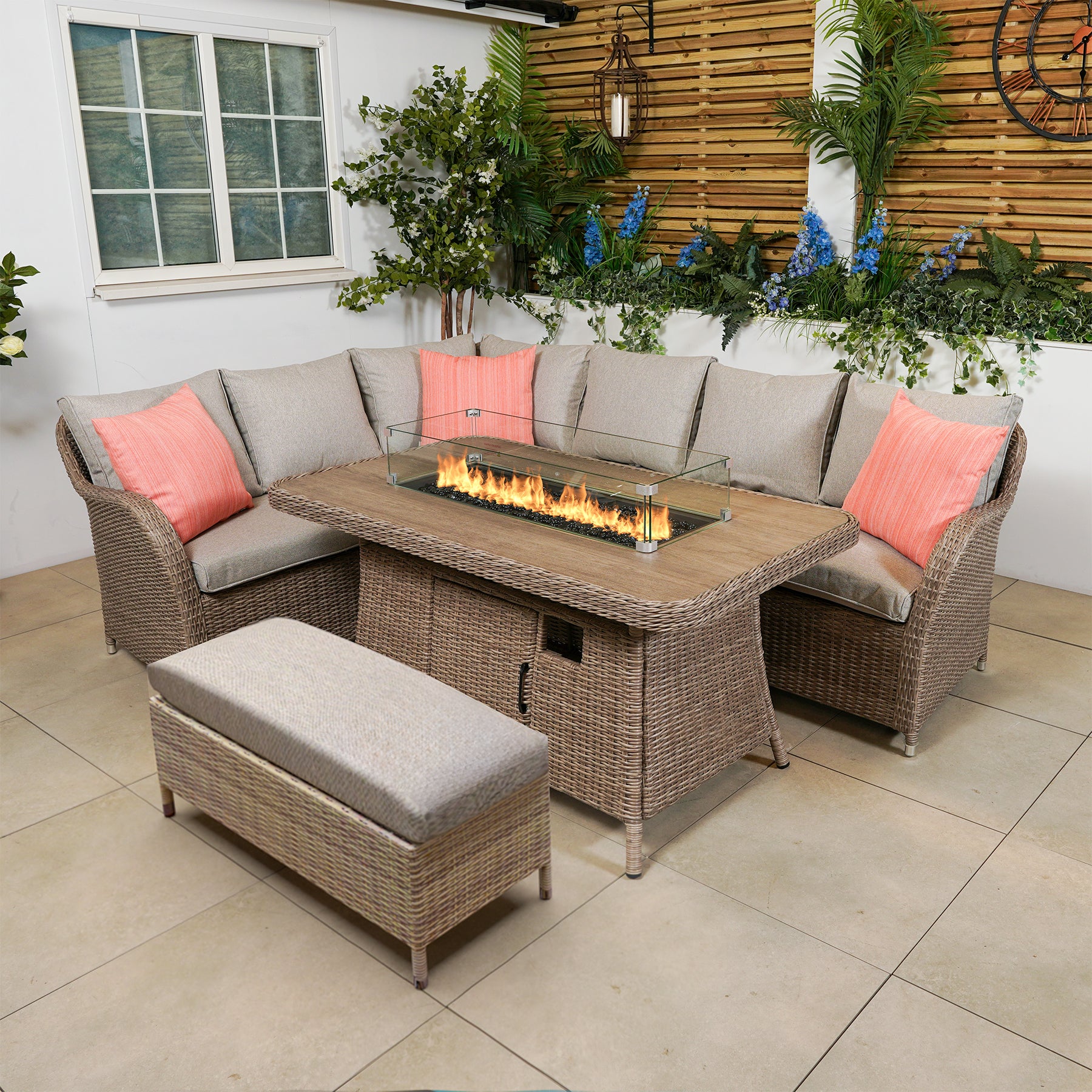 The Bracken Outdoors Montrose Rattan Corner Set with Fire Pit Table is the perfect setting for enjoying your garden into cooler evenings. The aluminium fire pit table is durable, weatherproof and easy to maintain. It is finished with an aluminium slat top table with wood effect and the fire pit in its centre. The glass surround acts as a windshield and protects guests from the fire. Use the lid to cover the fire pit when not in use. The gas bottle (not included with set) can be stored discreetly underneath and you can switch the gas on using the simple controls under the table. The Bracken Montrose garden furniture set is made from weatherproof wicker, wrapped around a strong aluminium frame. Its synthetic wicker is handwoven and is in a lovely warm colour shade to match the Kettler Fire Pit table. The sofa includes comfortable cushions with a foam core and double piping and is perfect for relaxing or dining. This right-handed corner fire pit set will fit into your garden setting and will look fabulous wherever you choose to place it. What's Included 1x Bracken Montrose 3 Seater Rattan Garden Sofa - Left Hand End 1x Bracken Montrose 3 Seater Rattan Garden Sofa - Right Hand End 1x Kettler Palma Fire Pit Garden Table 3x Bracken Montrose Rattan Garden Stools Set Features Material: Aluminium square tube frame with 6mm half round wicker Weatherproof, UV resistant wicker – leave outdoors all year round (except cushions) Durable and long-lasting – built to the highest specification with extra supports along sofa Cushions included 8cm foam core seat cushions Double piped back cushions for additional support Stain resistant cushions with shower resistance – we advise taking cushions indoors when not in use Seats 8 people (approx.) 3-year warranty Colour: Oyster Set Dimensions Corner Sofa: 85cm (H) x 206.5cm (W) x 80cm (D) 3-Seater Sofa: 85cm (H) x 178cm (W) x 80cm (D) Sofa's Seat Height: 48cm Sofa's Arm Height: 64cm Stool(s): 48cm (H) x 38cm (W) x 38cm (D) Table: 69cm (H) x 145cm (W) x 80cm (D) . Bracken Outdoors Montrose Rattan Corner Garden Furniture Set with Fire Pit Table, Early May 2025