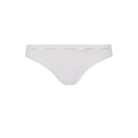 A classic thong cut with a subtle touch of lace makes this delicate, feminine brief from the Bottoms Up range by Calvin Klein an everyday must-have. Smooth and clean-cut, this thong is designed in a super comfortable and medium rise waist. The signature, elastic waistband is slim for a contemporary look, but still offers security and flexibility on your waist. The delicate, scalloped lace trims give this thong a girly edge for a touch of sensuality.