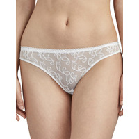 The Pour Toujours bridal collection from Aubade is certain to make you feel special on your big day. The elegant guipure lace which inspired by the recognisable buttons used on bridal designs add a unique vintage finish to this exquisite bridal lingerie line. These classic Tanga briefs have a high cut leg and minimal coverage combined with the embroidered transparent tulle fabric to create an ultra-seductive style. Matching items available from the Pour Toujours range from Aubade to complete your look.