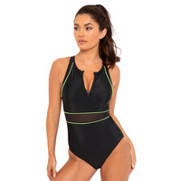 Stand out in the crowd with Pour Moi's sleek Energy collection. This high neck swimsuit provides modest chest coverage when zipped up or a sensual look for your bust with the zip down, perfect for any activity. The contrasting stripes add a modern flair to this high-neck swimsuit giving it a luxury feel with the mesh panelling on the waist exemplifying that fashion-forward look. This swimsuit has a traditional pull-on design for ease and a racerback style for a full range of motion and enhanced comfort. Streamlined and sexy, this swimsuit is perfect for any activity you do this season.