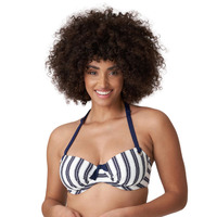 Explore the vintage navy style range of Leros from Prima Donna. This full cup bikini top uses three piece padded cups to ensure a firm support and a stunning lift, whilst the inside is lined to ensure your upmost comfort. The alternating pattern helps create a curve enhancing style as the flattering vertical stripes clash with those that are horizontal. A navy bow is added to the centre for a sweet addition and to continue a naval running theme. Silver decal hoops are placed on the side of the cups for extra decorative effect that compliment the colours and bring the running theme together. This ribbed terry clothes piece is a must-have for your next holiday.