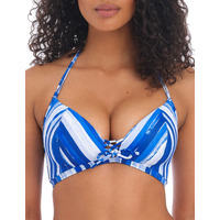 A softened look to the traditional triangle bikini top is brought to you from the Bali Bay collection by Freya. The cups are lightly padded to create a forward projection and security within the piece. But the padding still ensures a lightweight fit, which is especially perfect when wet. The hand painted print creates a bold and vivid style. Without the need for underwiring a rounded shape is created by the piece. Crossed tie detailing in the centre of the cups adds a fun addition. Fixed halter neck ties means that it is easy to find the fit which works best for you. Coupled with a classic plastic snap back clasp fastening for easy dressing.
