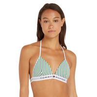 There is no better way to showcase your swimwear style than with the sporty look of this Tommy Hilfiger bikini top. The classic plunging neckline with triangle cups shows off your curves, with the open back only reinforcing the enticing design. A trendy underband with a recognisable Tommy logo closes on the back with a classic clip fastening. To finish off the iconic look, this bikini top features a halterneck tie-up closure and an eye-catching print with vertical stripes.