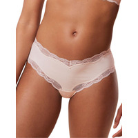 Upgrade your essentials this season with the Triumph Natural Spotlight hipster brief. Boasting a chic low-rise waist, this brief is perfect for wearing under your favourite jeans or skirts. The sheer lace detail edging adds a touch of sophistication and sensuality to everyday wear. Its minimal rear coverage is thoughtfully designed to ensure a seamless look under all outfits, offering you confidence without a second thought. Gusset lining is included for modesty, ensuring comfort all day long. Complete your Natural Spotlight set by pairing it with one of the matching coordinates available separately.