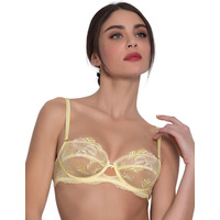 Invest in a sophisticated and gorgeously feminine look with this luxurious half-cup bra from the Frisson D'Or collection by Lise Charmel! The scalloped cup edges and multi-thread embroidered details craft an opulent aesthetic while beautifully framing your bust for a provocative and flattering fit. What's more, the double spaghetti straps with golden ring adornments and a jewel detail between the cups elevates the splendour of this bra for a mesmerising effect! With a hook and eye closure and adjustable straps, security and an adaptable fit are yours for the taking. Pair with matching briefs from the Frisson D'Or range for an exquisitely coordinated ensemble!