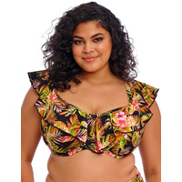Radiate confidence poolside with this underwired bikini top from Elomi's eye-catching Tiger Valley collection. Showcasing a beautiful tropical print and flirty off-the-shoulder ruffle, this bikini top is sure to elevate any swimwear wardrobe. A flattering straight neckline leads to shapely, non-padded cups that offer reassuring bust coverage for confident wear by the pool. Comfort is guaranteed thanks to the ultra-lightweight fabric and full lining, while narrow, adjustable straps offer a fit that's just right for you. Completed with a secure plastic clasp closure at the rear, this must-have bikini top pairs perfectly with bottoms from the Tiger Valley range.