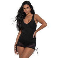 Get ready to turn heads and make a splash in the Pour Moi Dubai dress swimsuit. The plunging neckline adds a touch of allure, while the wireless and non-padded construction provides all-day comfort without sacrificing shape or support. But that's not all, this swimdress also features a tummy control panel to give you that sleek look we all crave when hitting the beach. And just when you thought it couldn't get any better, this piece also comes with a mesh skirt for an extra touch of flair. Adjustable ties on each side allow you to customize the fit to your unique body shape, ensuring a comfortable and secure fit. And for those who prefer a little more coverage, don't worry, this swimdress offers moderate rear coverage, so you can feel comfortable and confident without sacrificing style.