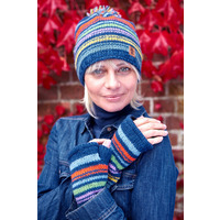 Hexham Bobble Beanie Denim - Rainbow stripes with a Pachamama twist. This bobble beanie will brighten up any winter day!Womens hand knitted wool rainbow stripe bobble hat fair trade and handmade in Nepal.100% Wool fine knitting outerFleece lined around forehead for comfortHand knittedFairly tradedMade in Nepal