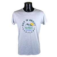 A grey cotton T-shirt displaying a nature scene and the phrase Oot 'n' Aboot.