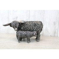 A silver textured resin ornament featuring a Highland Cow mother and child