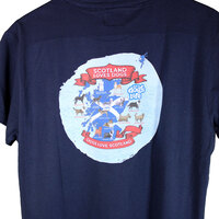 A Tee Shirt featuring a picture of scotland with the words: Scotland loves dogs and Dogs love Scotland surrounding it.