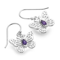 Simple lines and the natural form of the butterfly combine in these stylish sterling silver earrings with a stunning Amethyst stone. Created by Cornish jewellery designers. Features:Material: 925 Sterling SilverStone: AmathystDimensions: 13mm height x 16mm wide