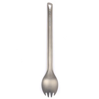 Built for durability and ultralight performance this long-handled spork is crafted from food-grade titanium offering the strength of steel at nearly half the weight. The extended handle finished with a sandblasted texture provides a secure comfortable grip even with gloves on.Key Features:Spoon-fork hybrid designUltralight yet tough titanium alloy constructionTextured handle for better gripExtended length for deep containersHanging hole for easy storageSpecs:Weight: 21 gDimensions: 10 &215; 38 &215; 215 mmMaterial:100% food-grade titanium