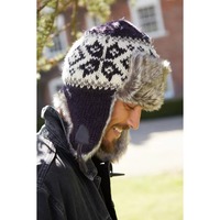 The bold snowflake pattern is inspired by the glacial wilderness of the Yukon. Keep cosy with this trapper hat lined with faux fur for extra warmth.100% Wool OuterFaux fur liningHand knittedToggle on ear flapsFair Trade and Handmade in Nepal