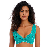 This Freya Jewel Cove bikini top features a deep plunging neckline with a waterfall frill along the neckline. The cups have power-net linage for support, plus an underwire and non-padded design to ensure comfort. For added versatility the bikini top comes with a J Hook feature, allowing you to convert the back easily, while adjustable shoulder-length straps and classic clasp closure complete the look. If you re looking for a coordinated set, matching items are also available in Freya's Jewel Cove range so you can upgrade your swimwear wardrobe to the next level.